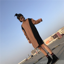 秋冬新款韩版中长款圆领撞色拼接卫衣女上衣外套开叉长衫潮 包邮
