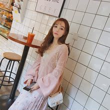 日系甜美春装新款2017全棉镂空针织衫宽松套头上衣透视慵懒外套女