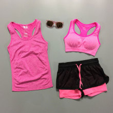 夏季健身房三件套装瑜伽运动速干背心女跑步跳操防震文胸短裤套装