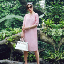 Lamodin2016春夏新品复古丝麻连衣裙宽松中式桑蚕丝七分袖中长裙