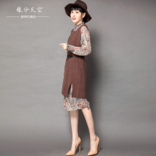 欧洲站2016秋季女装新款开叉中长针织衫+复古碎花连衣裙两件套装