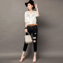 棉麻衬衫女长袖韩范中长款宽松夏韩版简约显瘦双口袋微透性感上衣