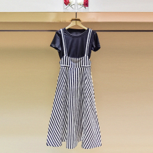 气质小香风2017春款连衣裙拼接时尚条纹背带裙女中长款裙子两件套