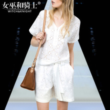 2017夏装欧美时尚小清新短袖V领上衣套装短裤两件套蝴蝶结系带女