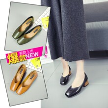 2016韩范软面复古方头中跟套脚奶奶鞋舒适透气粗跟百搭浅口单鞋女