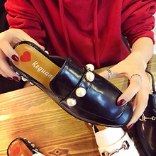 2017春夏英伦风复古方头珍珠跟低跟套脚大方扣包头韩范透气半拖鞋
