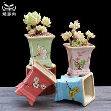 烤多肉 多肉植物花盆 创意个性陶瓷粗陶方形手绘盆 复古景德镇盆