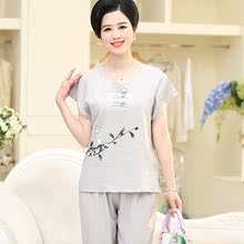 中老年女装麻棉套装短袖圆领t恤衫老人50-60-70岁大码夏装胖