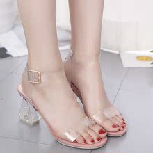 粗跟中跟凉鞋女2017夏季新款潮高跟鞋透明一字扣带露趾女鞋水晶鞋