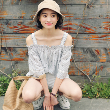 2017夏装小清新一字领吊带上衣女露肩短袖娃娃衫韩饭宽松棉麻衬衫