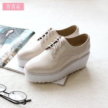 秋款女鞋圆头真皮女厚底松糕鞋米白色深口休闲中跟鞋子系带低帮鞋