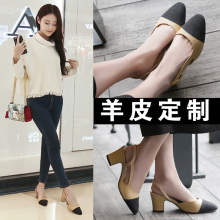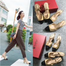 鞋子女春2017新款百搭韩版单鞋女粗跟包头凉鞋女拼色鞋女高跟鞋潮