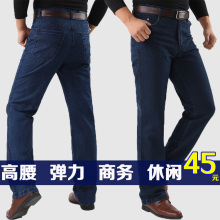 秋季新款男士牛仔裤高腰深裆宽松男裤弹力双褶中老年休闲牛仔长裤