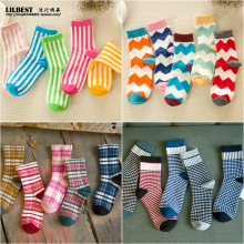 袜子全棉女千鸟格苏格兰细方格竖条纹波浪中筒潮袜糖果色百搭短袜