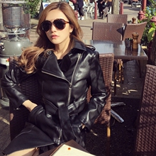 周扬青 外套女2017春韩版中长款收腰修身显瘦翻领长袖 皮衣风衣