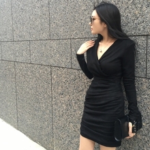 周扬青 连衣裙女2017新款春装修身显瘦V领长袖气质 麂皮小黑裙