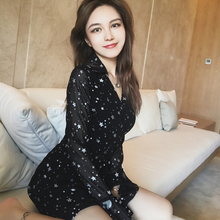 周扬青 2017新款韩版雪纺V领长袖喇叭袖系带显瘦 星星连衣裙