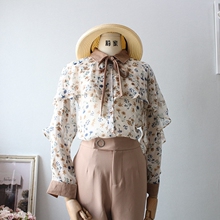 2017春装新款森系甜美小清新淑女系带撞色领印花雪纺衫长袖衬衫