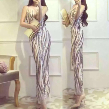 包邮!2017夏季新款名媛气质重工亮片网纱刺绣连衣裙礼服长裙