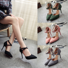 2017春季新款韩版高跟鞋尖头中跟粗跟绒面单鞋交叉绑带罗马女鞋子