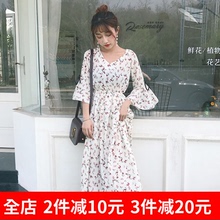 2017夏季新款韩版小清新碎花喇叭袖长裙甜美高腰显瘦雪纺连衣裙女
