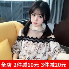 春夏女装韩版网纱蕾丝拼接碎花雪纺衫短袖露肩宽松学生上衣打底衫