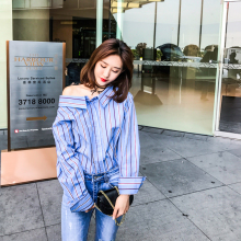 宽松假两件衬衫女韩范白色衬衣2017春装新款V领条纹长袖露肩上衣