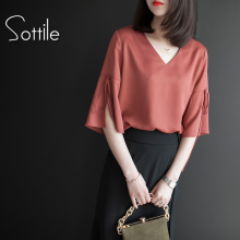 2017新款小衫时尚V领喇叭袖雪纺上衣缎面五分袖气质百搭雪纺衫T恤