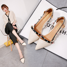 2017新款韩版时尚尖头铆钉中跟凉鞋女粗跟通勤百搭工作鞋舒适女鞋