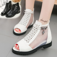 2017春夏季新款女鞋鱼嘴网纱平底凉鞋水钻镂空内增高坡跟罗马凉鞋