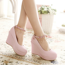 2017春秋新款甜美坡跟单鞋女鞋浅口高跟鞋圆头厚底防水台公主鞋子
