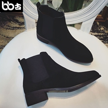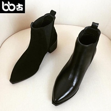 BB古 真皮切尔西尖头平跟短靴 女春秋裸靴马丁靴磨砂粗跟及踝靴