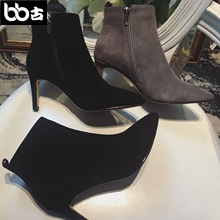 BB古 真皮韩版高跟短靴尖头细跟及裸靴磨砂裸靴低跟绒高跟鞋女靴