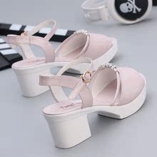 女夏休闲欧美舒适高跟鞋水钻凉鞋鱼嘴防水台 罗马款搭扣中空女鞋