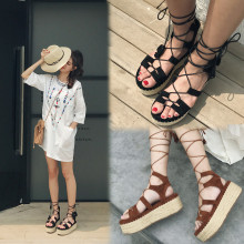 松糕凉鞋女2017新款夏厚底坡跟罗马鞋韩版草编系带粗跟高跟绑带鞋