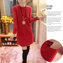 女装秋装新款韩版毛衣长袖蕾丝中长款连衣裙女加厚打底裙针织裙女