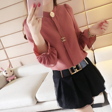 2017女装春装新款韩版纯色雪纺衬衫立领修身显瘦泡泡袖打底衫女潮