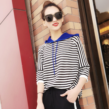 新款经典连帽撞色抽绳条纹宽松大码T恤中袖显瘦上衣女