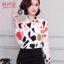 雪纺衫女2017春装新款女装长袖印花韩范衬衫女大码V领打底衫女潮