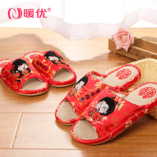 结婚拖鞋 喜庆红色亚麻拖鞋室内女式男士老公老婆双喜婚庆凉拖鞋