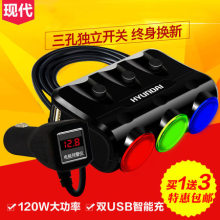 现代一拖三点烟器带开关双usb一分二车载充电器一分三带线通用
