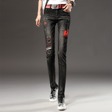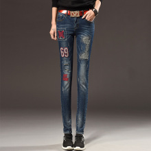牛仔裤女秋装新款时尚新潮刺绣破洞显瘦弹力紧身小脚铅笔裤长裤子