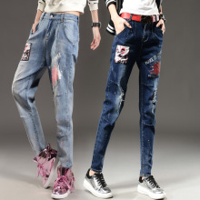 牛仔裤女长裤宽松哈伦裤女图案显瘦高腰潮流时尚破洞2016春秋韩版