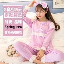 春秋季长袖纯棉花边套头睡衣女夏季甜美可爱公主加大码家居服套装