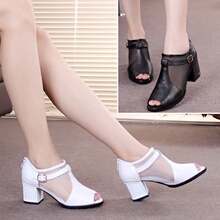 2017夏季新款真皮白色罗马凉鞋女鱼嘴鞋网纱镂空女鞋粗跟透气凉靴