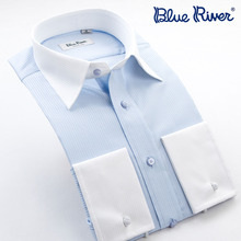 蓝河男士法式衬衫男长袖正装西装衬衣寸袖扣袖钉蓝色商务宴会礼服