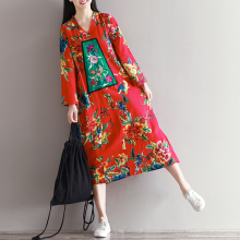 2017夏季中国风复古连衣裙民族风舒适宽松大码假两件印花棉麻长裙