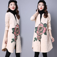 2016秋冬新款大码夹棉加厚复古印花盘扣开衫长袖中长款风衣外套女