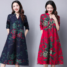 2017春秋季新款大码女装中长款宽松加厚印花A字裙长袖棉麻连衣裙