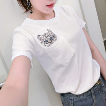 林希家白色T恤女口袋刺绣小猫咪纯棉夏韩版宽松圆领纯色显瘦短袖